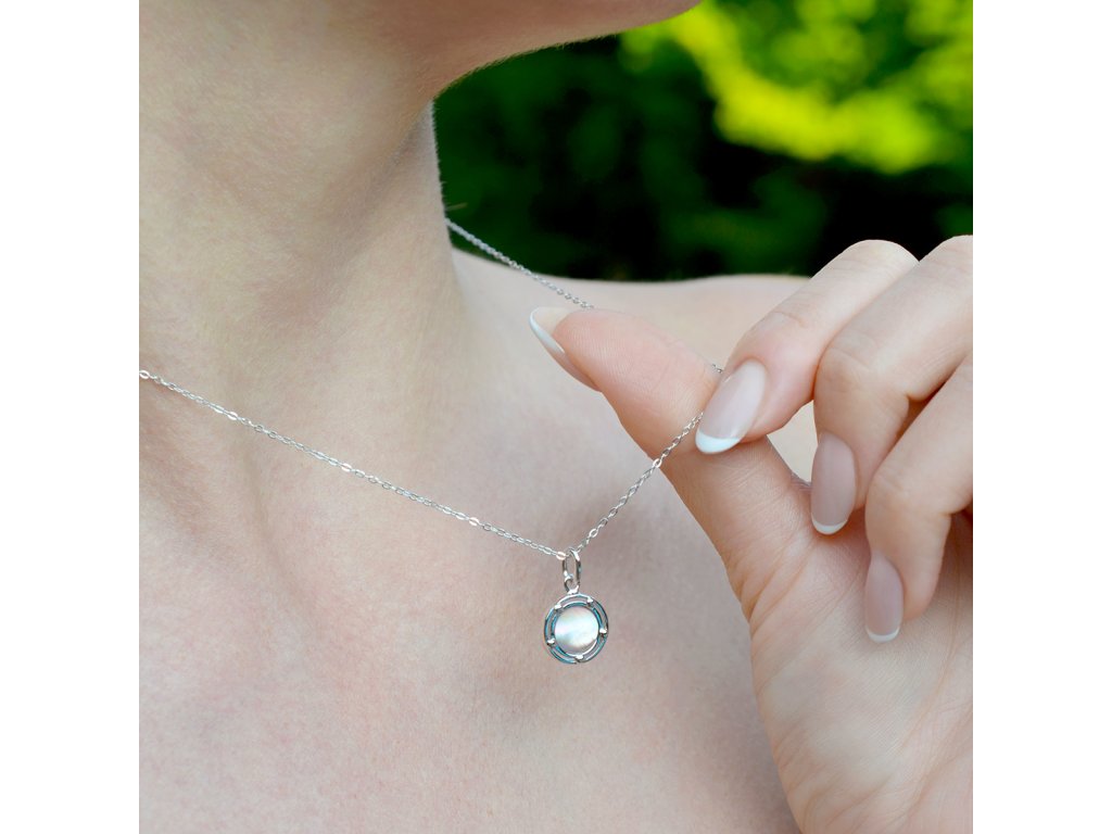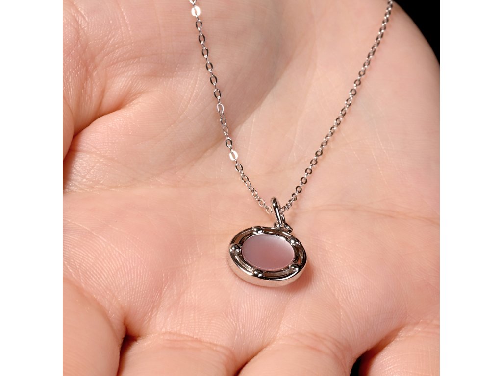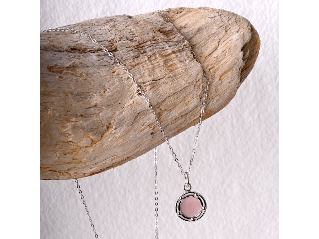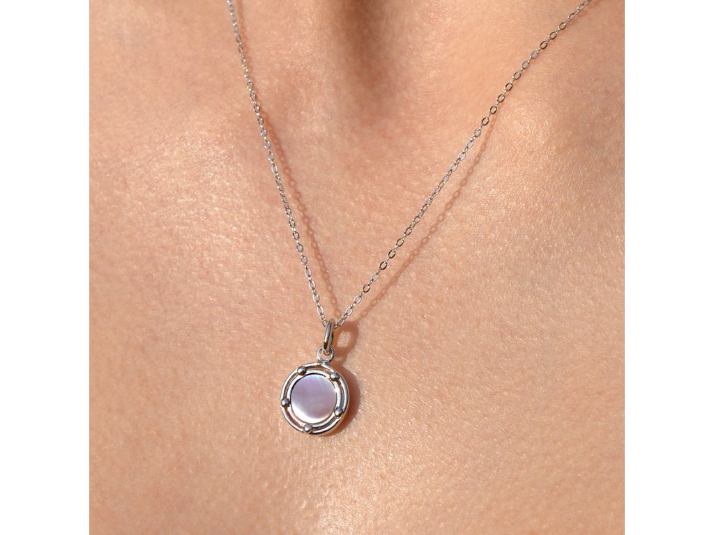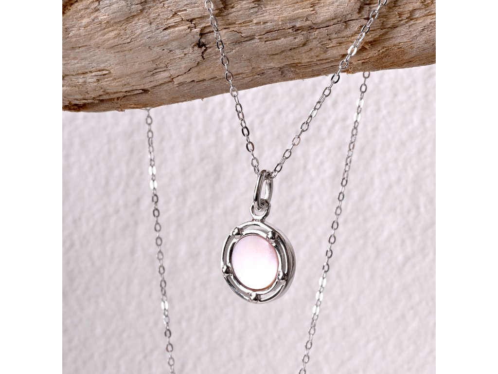 Náhrdelník s přívěskem je vytvořen ze stříbra ryzosti 925/1000 s rhodiovou úpravou, která poskytuje šperku maximální ochranu před poškrábáním, zežloutnutím i zčernáním. Precizně zasazená jemně růžová perleť je něžně obemknuta pozlaceným stříbrem, čímž vytváří dokonalou harmonii barev a tvarů. Kulatý přívěsek s perletí zachycuje proměnlivost světla - při každém pohybu hraje jemnými barvami, které okouzlují svou křehkou krásou.