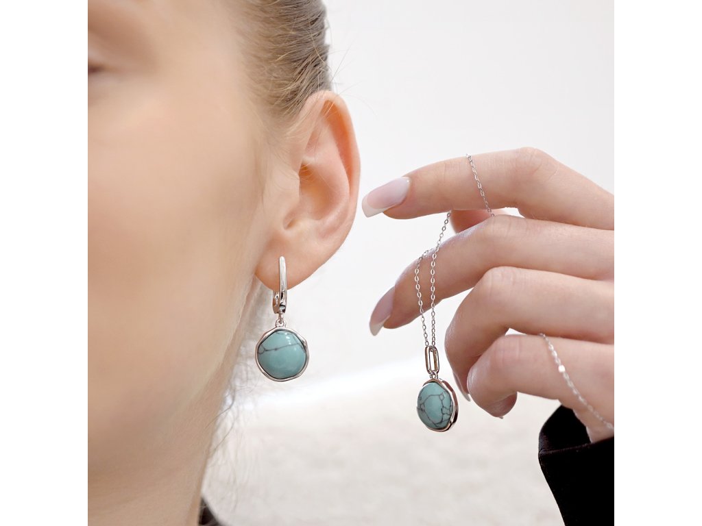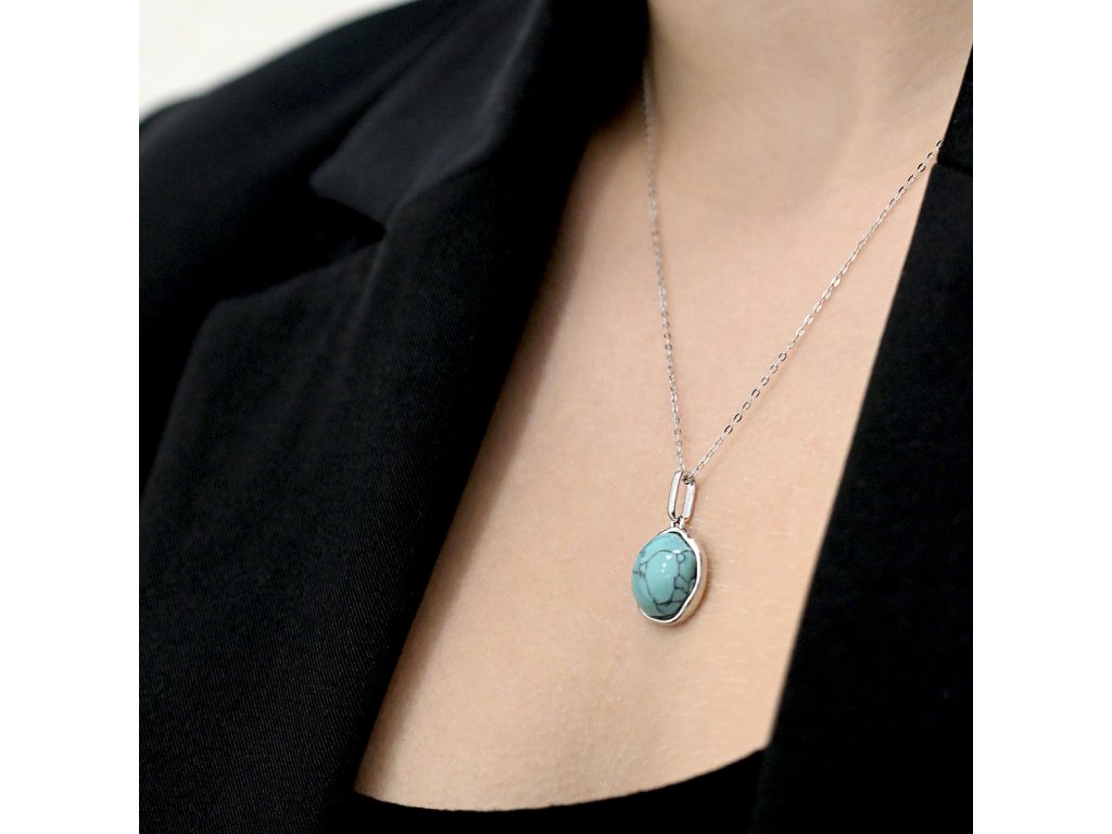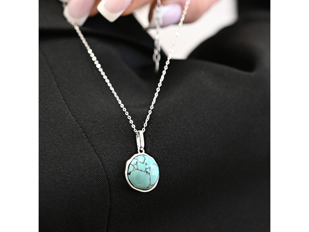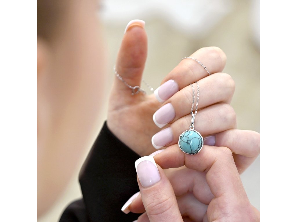 Náhrdelník s přívěskem je vytvořen ze stříbra ryzosti 925/1000 s rhodiovanou úpravou, která poskytuje šperku maximální ochranu a čistý, zářivý lesk. Precizně zasazený přírodní tyrkys v charakteristické modrozelené barvě zaplňuje kulatý přívěsek s jemně zvlněným okrajem. Jemná stříbrná linka lemující kámen vytváří harmonický a přesto dynamický celek, který zachycuje energii přírody v jediném okamžiku.