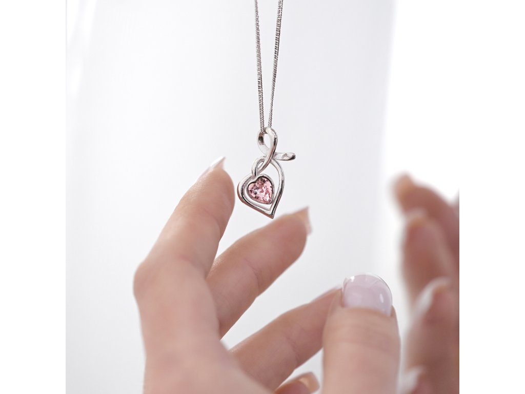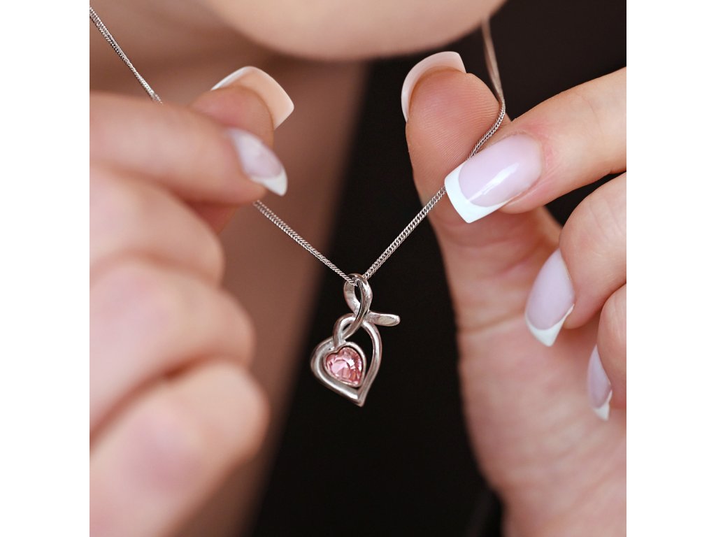 Na řetízku je zavěšen stříbrný přívěsek ve tvaru srdce zdobený srdcovým růžovým Swarovski krystalem.