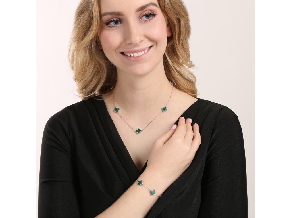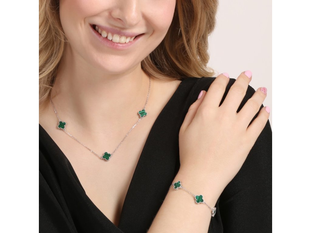 Tento stříbrný náramek zaujme především svým originálním designem. Čtyřlístky, které jej zdobí, jsou vyplněné pravým zeleným malachitem, který dodává šperku jedinečný vzhled.