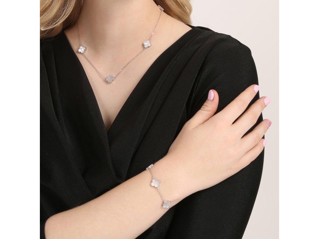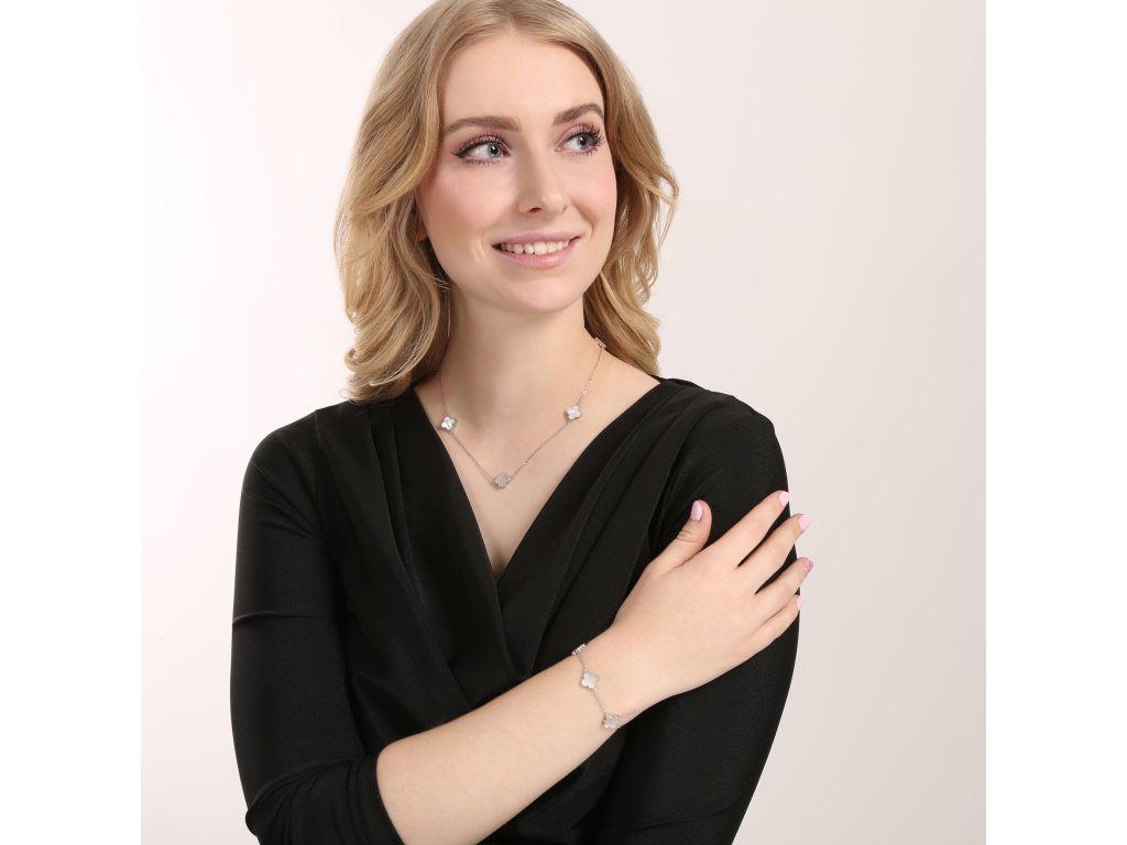 Tento stříbrný náramek zaujme především svým originálním designem. Čtyřlístky, které jej zdobí, jsou vyplněné jemnou bílou perletí, která dodává šperku jedinečný vzhled.