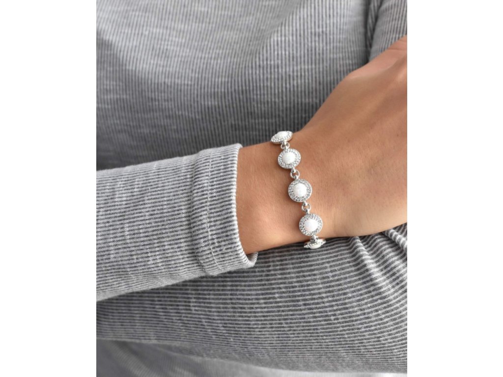 Zdobíte se ráda luxusními originálními šperky? Pak by vám ve šperkovnici neměl chybět náš stříbrný náramek zdobený syntetickými opály a Preciosa krystaly!Stříbrný náramek 33105.1 je vyroben ze stříbra ryzosti 925/1000, jehož povrch byl ošetřen rhodiem. Rhodium šperk ochrání proti zčernání, zežloutnutí i poškrábání. Náramek je složen z několika stříbrných koleček, do kterých je vsazen bílý syntetický opál. Opál je navíc lemován dvěma řadami třpytivých Preciosa krystalků v bílé barvě. Jelikož náramek neobsahuje přídavek niklu, mohou jej bez obav z alergické reakce nosit i alergici.