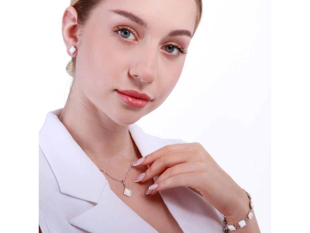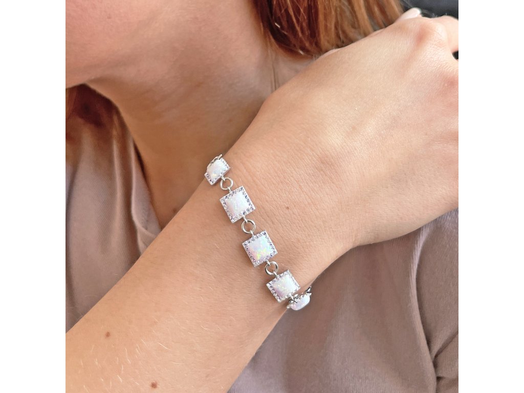 Stříbrný náramek se syntetickým opálem a krystaly Preciosa bílý čtverec 33047.1 white