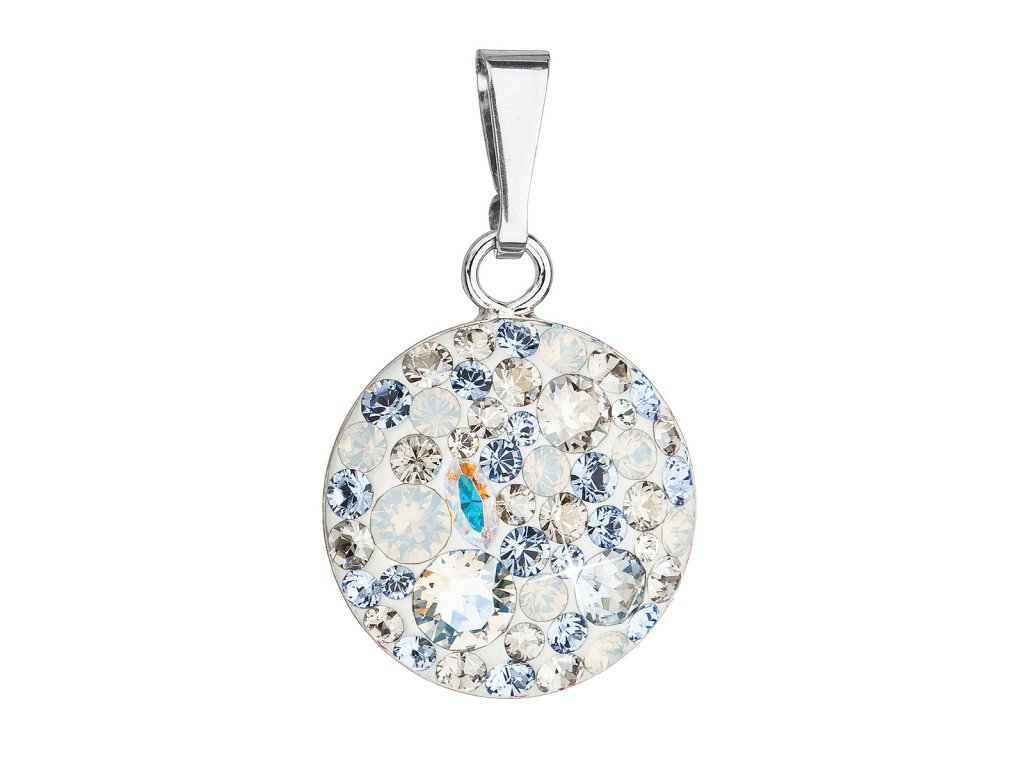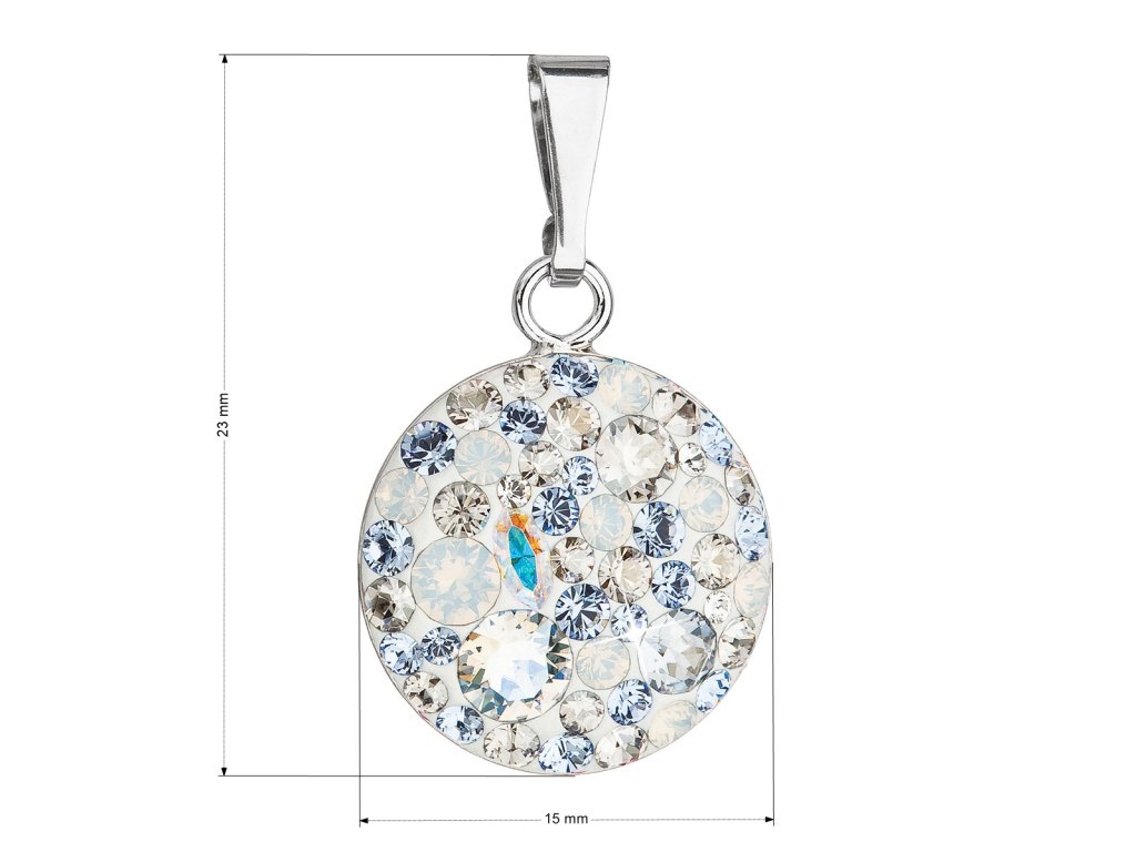 Stříbrný kulatý přívěšek 34225.3 má průměr 15 mm a je zdobený mnoha malými kulatými Swarovski krystalky v různých barvách. Na