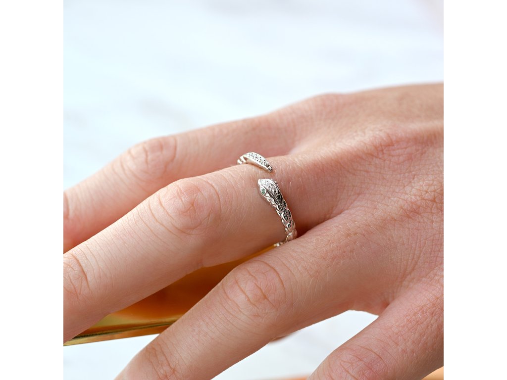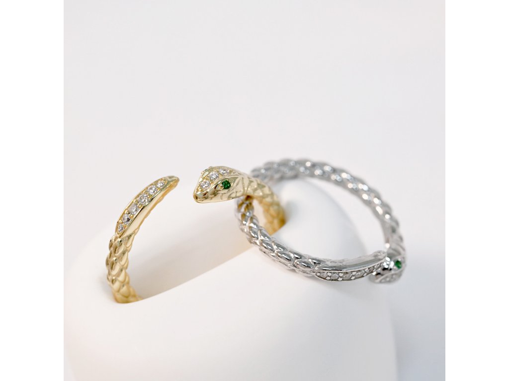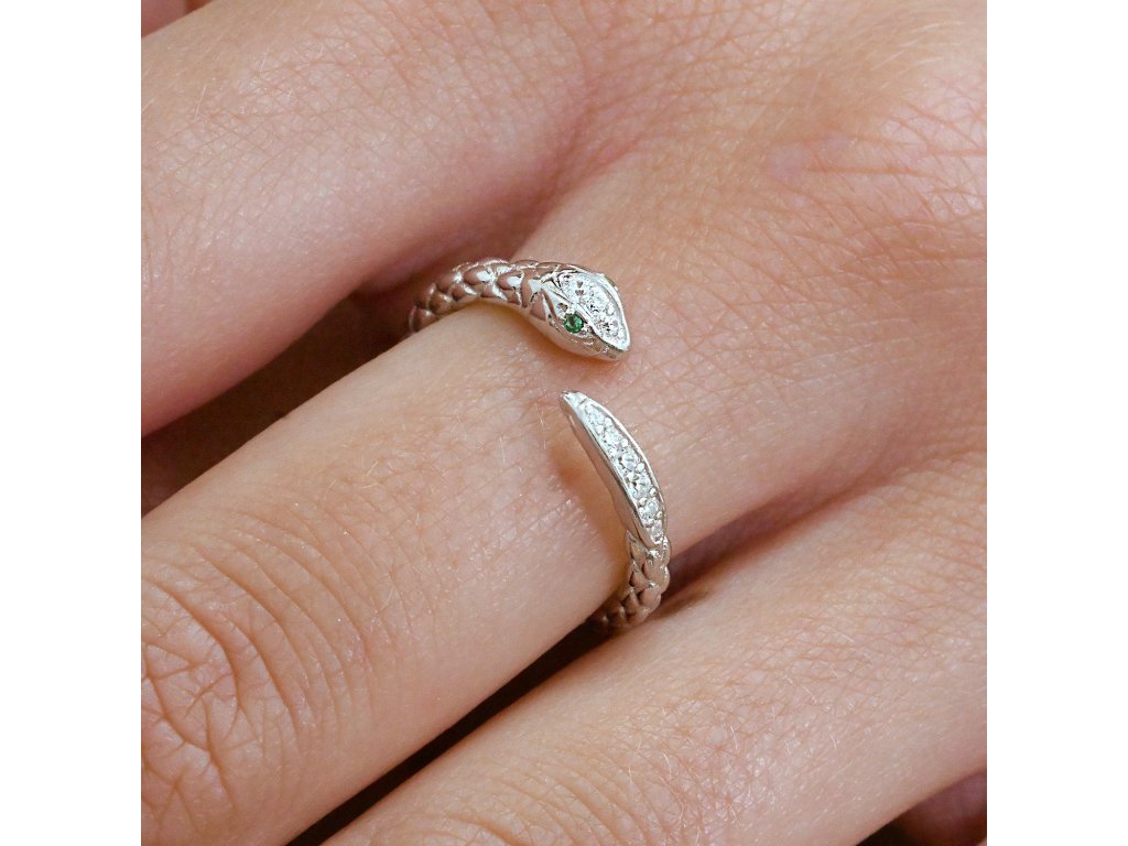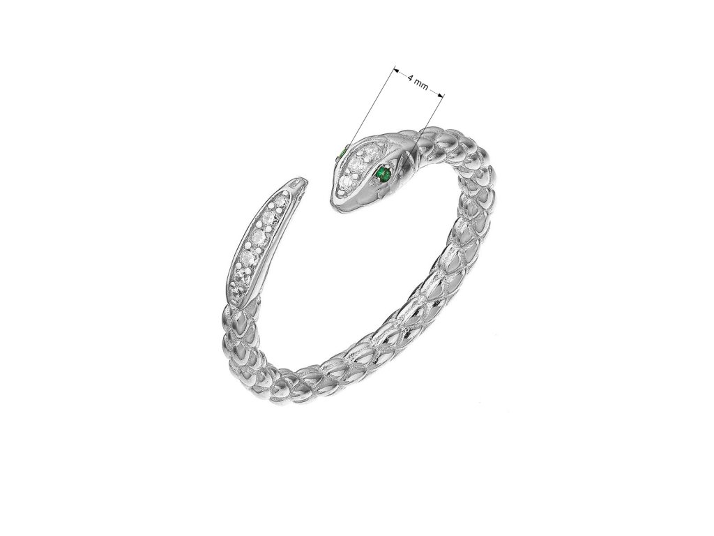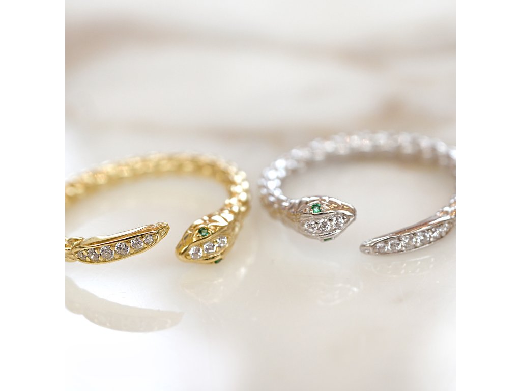 Tento oblíbený prsten, kterým je obtočený had kolem vašeho prstu je vyroben ze stříbra o ryzosti 925/1000 a je opatřen vrstvou rhodia, která šperk ochrání před zčernáním, zežloutnutím nebo poškrábáním. Na místě očí hada jsou vsazené zelené zirkony.