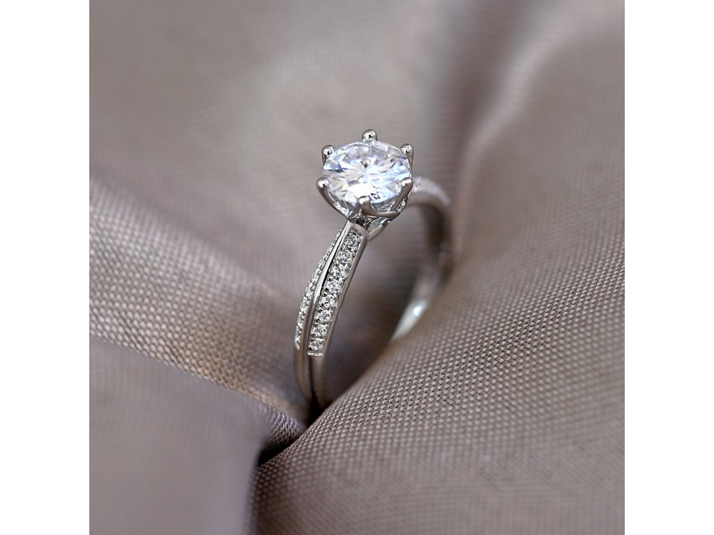 Nejenom zásnubní prsten ze stříbra ryzosti 925/1000 s precizně vsazenými drobnými zirkony a dominantním zářivým pravým moissanitem v klasickém osazení je ztělesněním luxusní elegance. Propracovaný vzor na obroučce dodává prstenu výjimečný charakter a luxusní nádech.