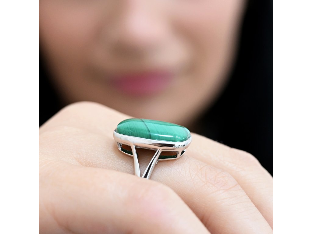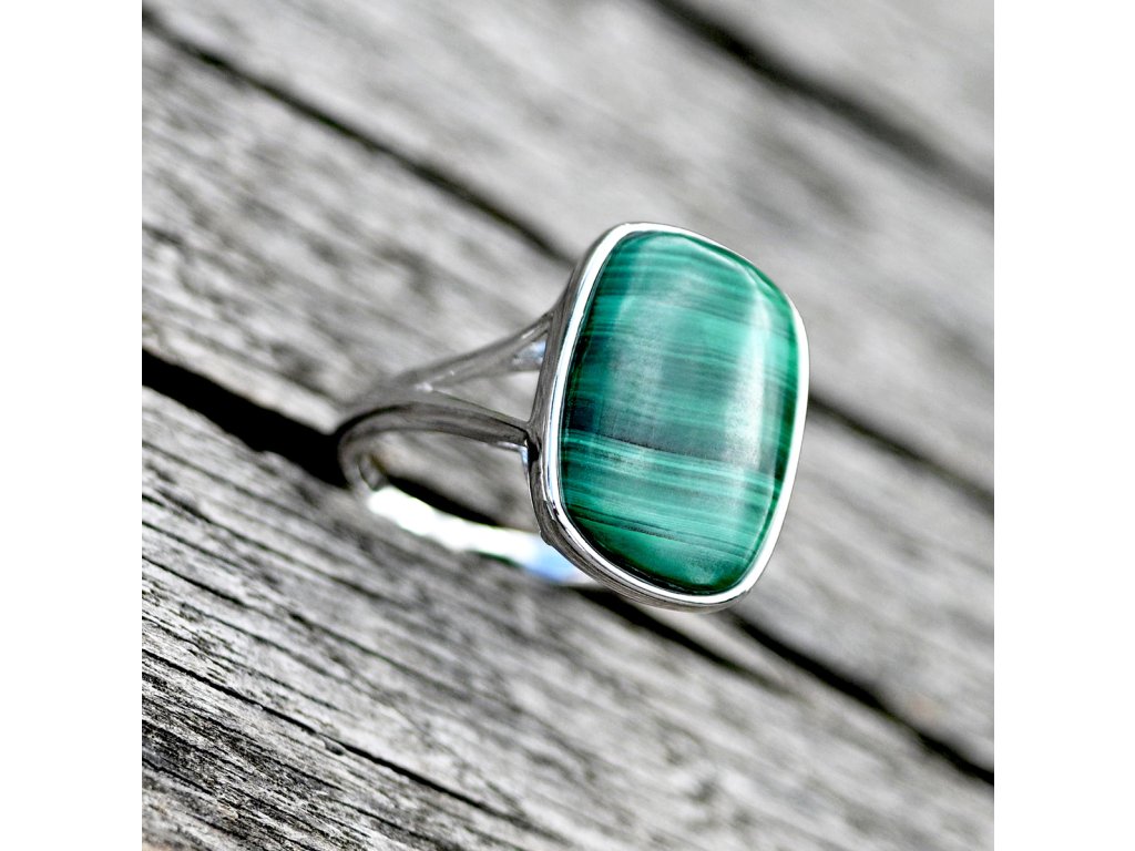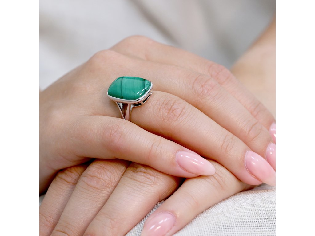 Prsten je vyroben z ryzího stříbra té nejvyšší kvality 925/1000, dokonale chráněného luxusní rhodiovou úpravou, která dodává šperku nepřekonatelný lesk a ochranu před oxidací. Výrazný obdélník je vyplněn vzácným malachitem v sytých, hlubokých odstínech zelené, který v sobě ukrývá mystickou energii přírody. Každý kus tohoto šperku je unikátní - malachit s charakteristickou zelenou kresbou připomíná tajemné krajiny a dechberoucí přírodní scenérie.