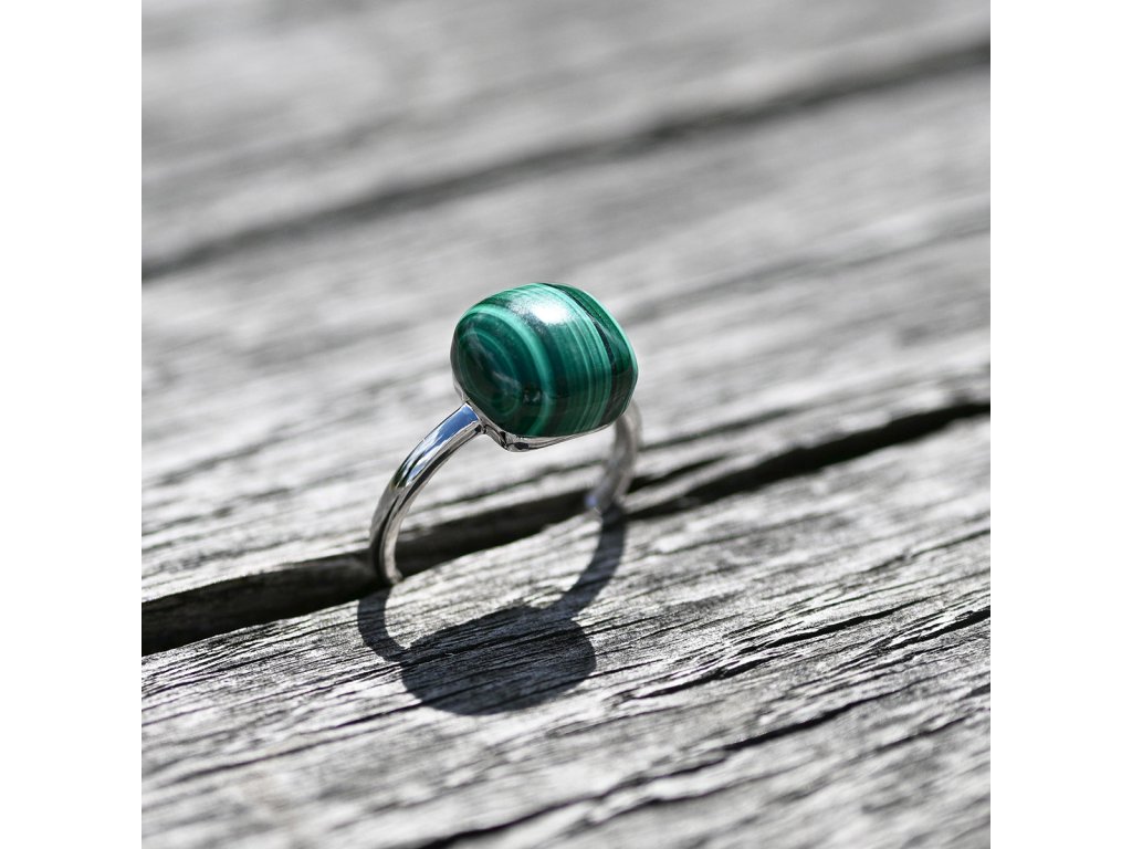 Prsten je vyroben ze stříbra ryzosti 925/1000 s rhodiovou povrchovou úpravou, která chrání šperk proti poškrábání a dodává mu zářivý lesk. Kámen malachit ve tvaru čtverce s charakteristickým zeleným žíháním přitahuje pohledy a dodává šperku jedinečný vzhled. Malachit je zaoblený, hladký jako oblázek.