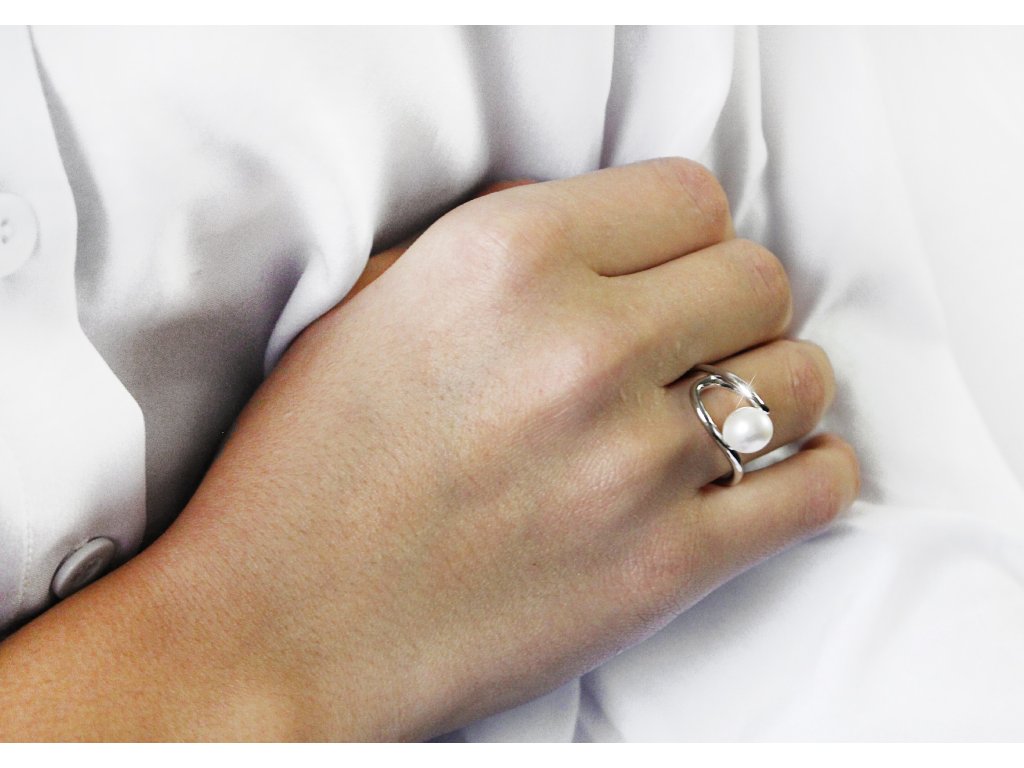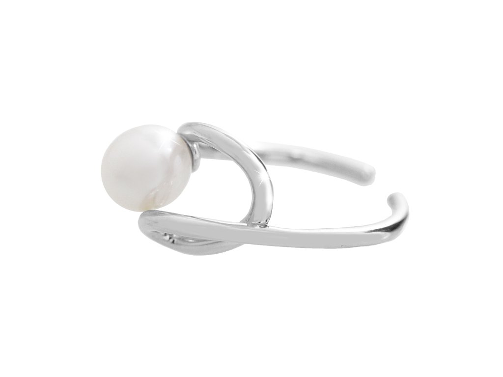Stříbrný prsten s říční perlou vsazenou do vlnky z kovu White (Stříbro 925/1000)
