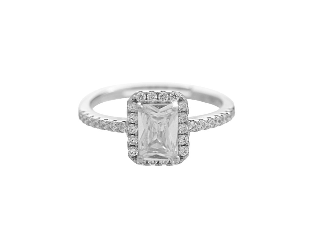 Stříbrný prsten velký obdélníkový zirkon a drobné Kubické zirkony kolem něj Crystal (Stříbro 925/1000)