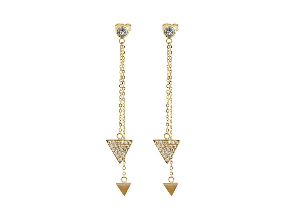 Zlaté ocelové náušnice puzety dva trojúhelníky na řetízku s krystaly Swarovski Crystal