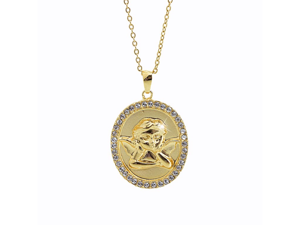 Zlatý náhrdelník z bižuterní slitiny ovál s reliéfem anděla a s krystaly Swarovski Crystal