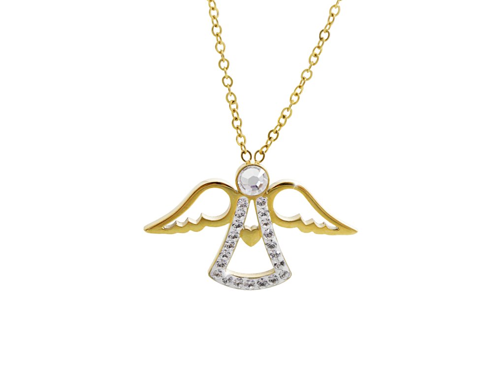 Zlatý ocelový náhrdelník anděl v letu se srdíčkem a s krystaly Swarovski Crystal