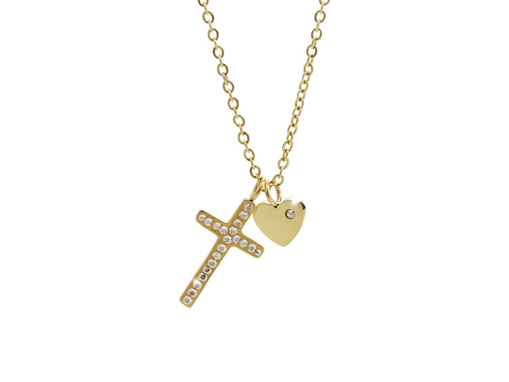 Zlatý ocelový náhrdelník kříž a srdce s krystaly Swarovski Golden Shadow