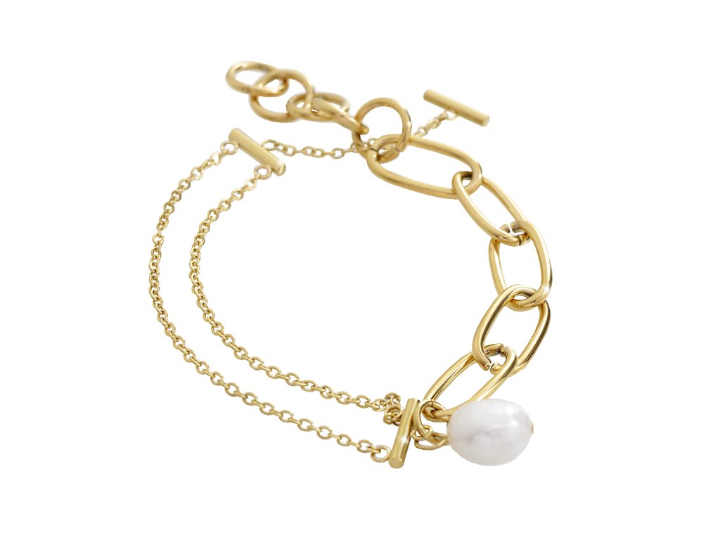 Zlatý ocelový náramek jeden řetěz a dva řetízky doplněný o perlu White