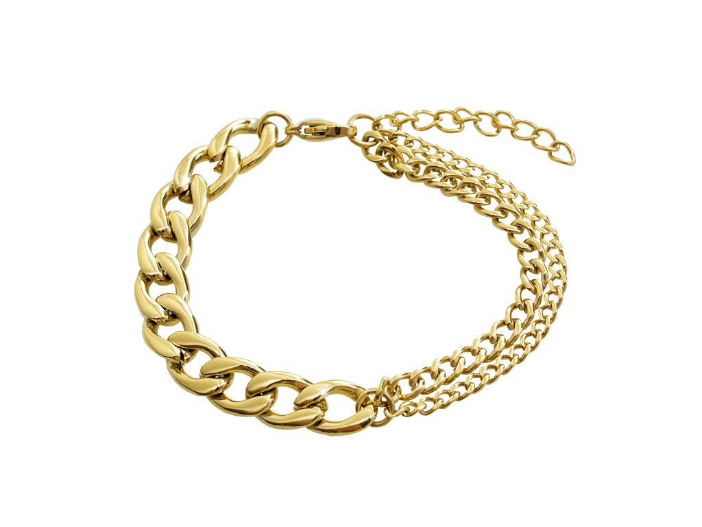 Zlatý ocelový náramek půl řetěz a půl dva řetízky bez krystalů